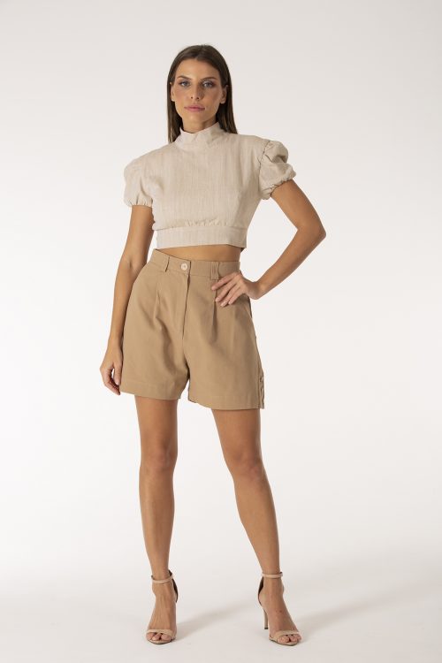 Blusa cropped com design original DA Couture, construída em tecido de algodão sustentável. Detalhe em gola alta com fechamento em botões. Na parte posterior grande decote com fechamento em laço.