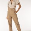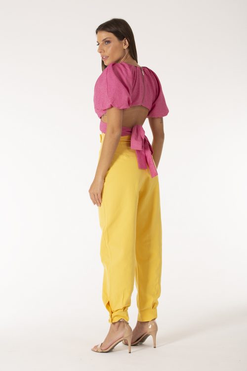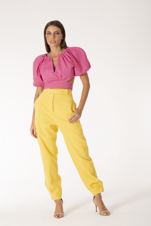 Calça slouchy com design original DA Couture, modelado em tecido reciclado de algodão e algodão sustentável. Detalhe em ecobotões na barra lateral com fechamento frontal em ecobotão de algodão.