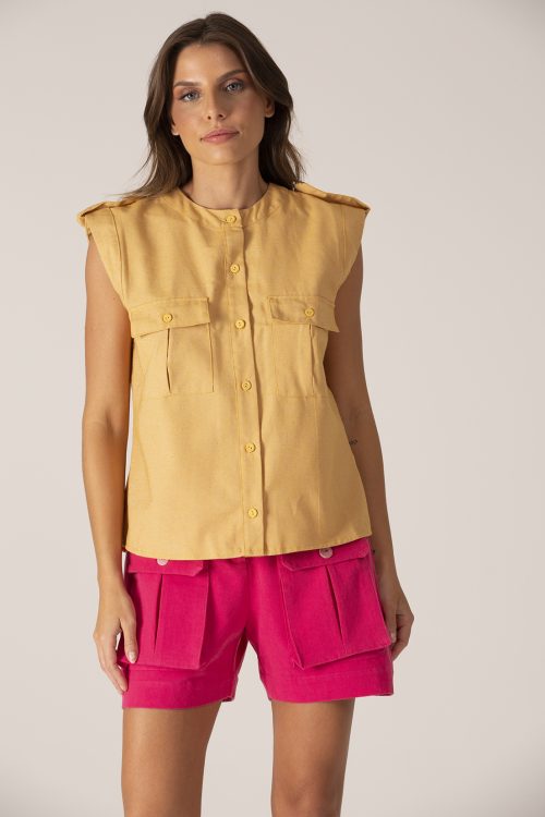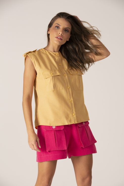 Camisa sem manga com design original DA Couture, construída em tecido de algodão sustentável, detalhe nos ombros e bolsos na parte frontal, fechamento em ecobotões de algodão.