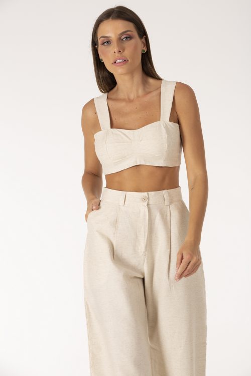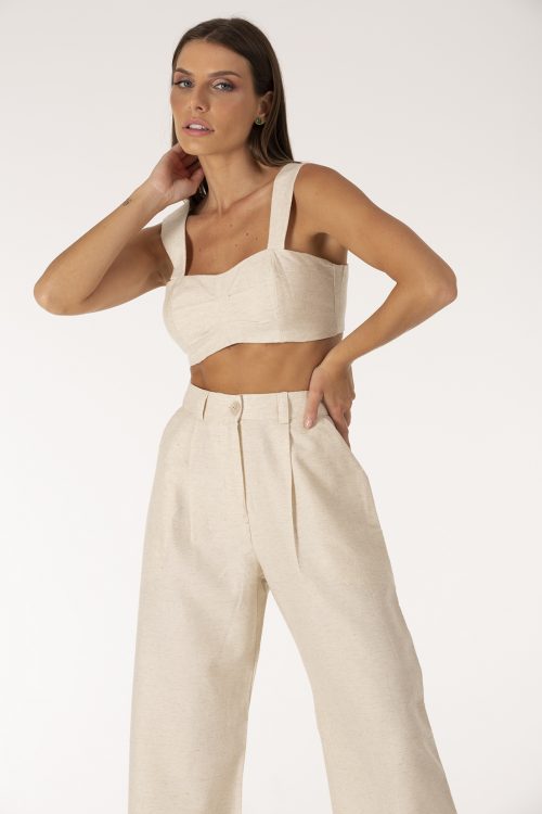 Conjunto de Calça e Top com design original DA Couture, modelado em tecido sustentável misto de linho com seda.