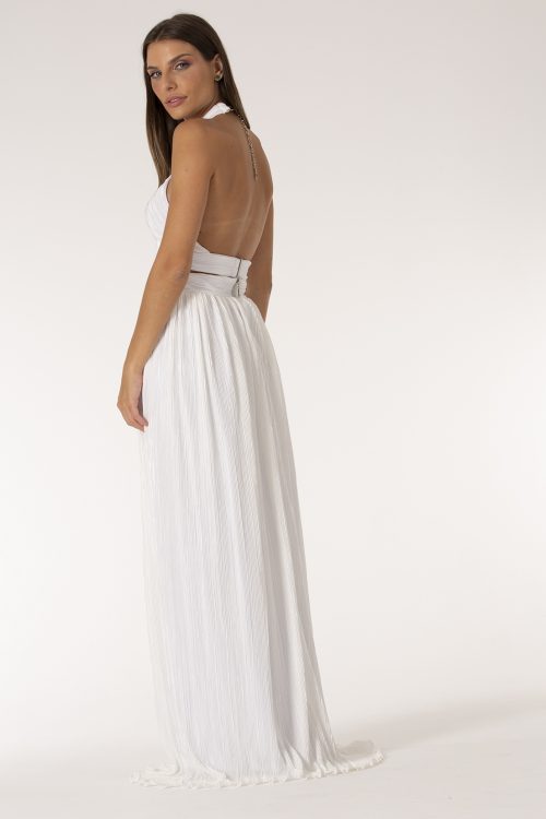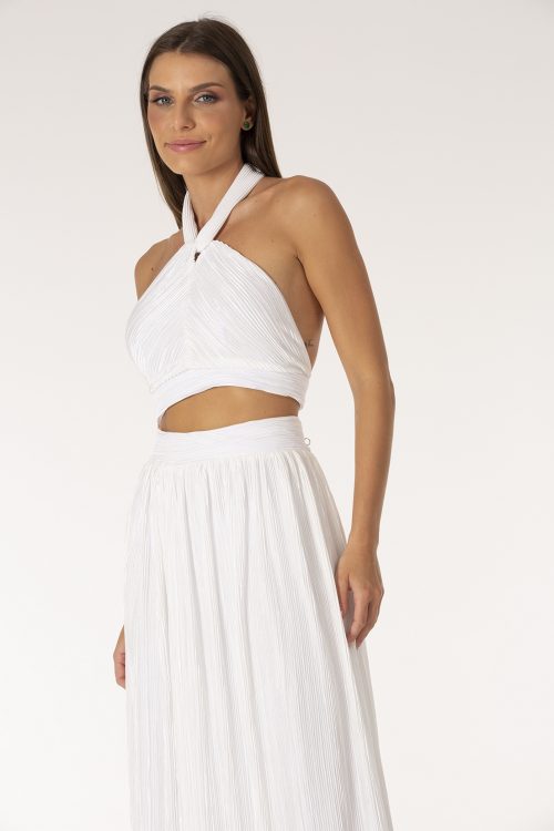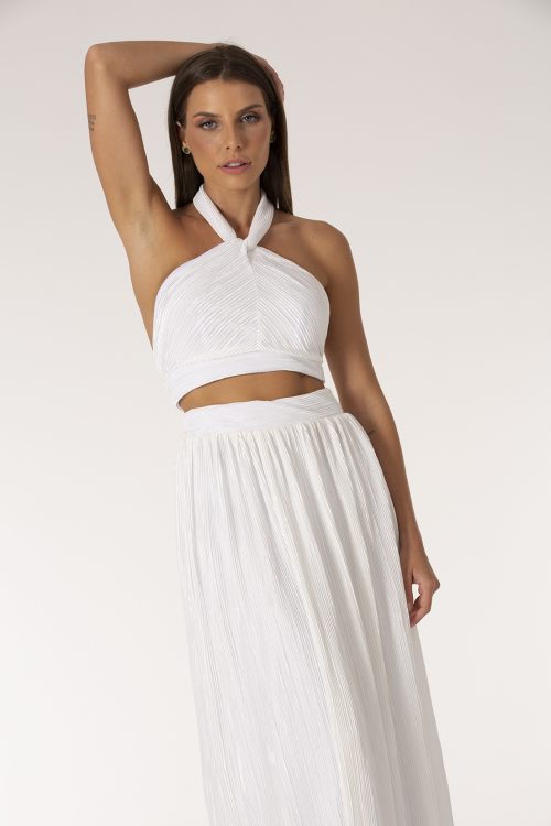 Conjunto composto por top cropped e saia longa, design original D/A Couture, construídas em tecido plissado, acetinado, top com fechamento ajustável no pescoço e costas com decote e fechamento em metal. A saia longa possui fechamento nas costas em zíper personalizado.