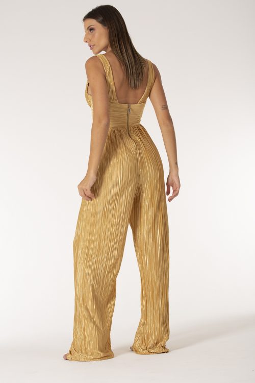 Macacão com design original D/A Couture, construído em tecido plissado, acetinado, estruturado no busto com fechamento nas costas em zíper personalizado.