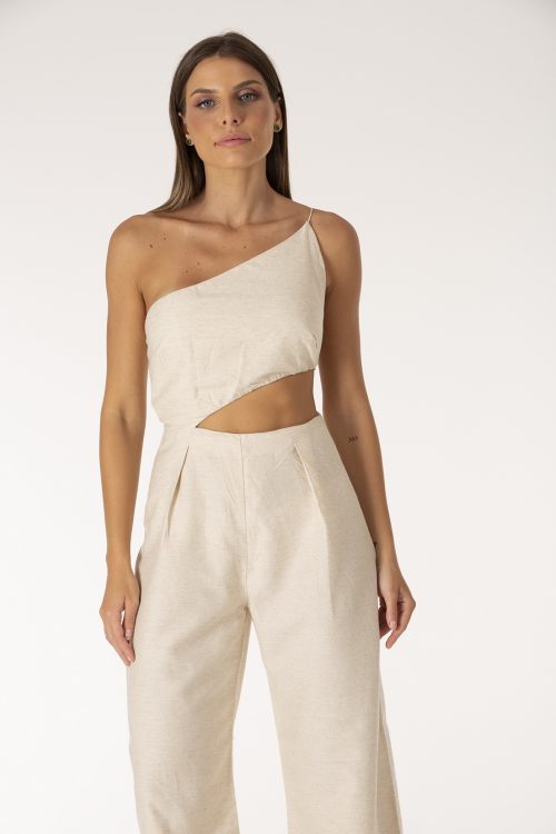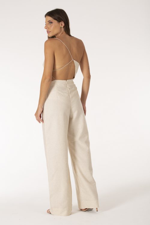 Macacão com design original DA Couture, modelado em tecido sustentável misto de linho com seda, recortes na frente e decote geométrico nas costas.