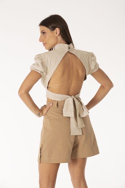 Shorts evasé com design original DA Couture, modelado em tecido reciclado de algodão e algodão sustentável. Abertura lateral com detalhes e fechamento frontal em ecobotões de algodão.
