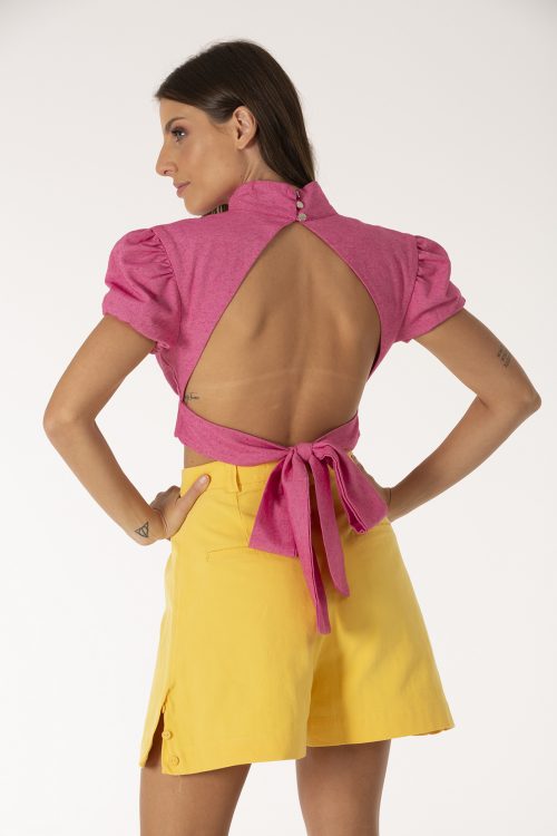Shorts evasé com design original DA Couture, modelado em tecido reciclado de algodão e algodão sustentável. Abertura lateral com detalhes e fechamento frontal em ecobotões de algodão.