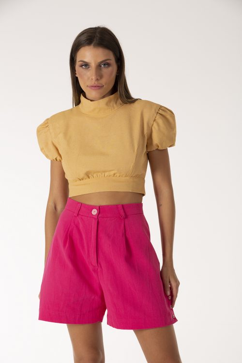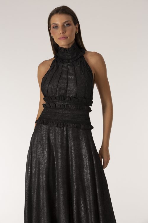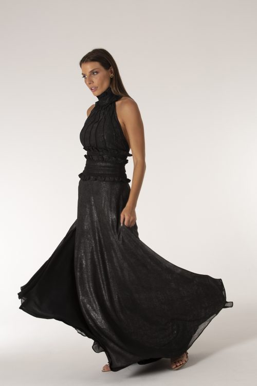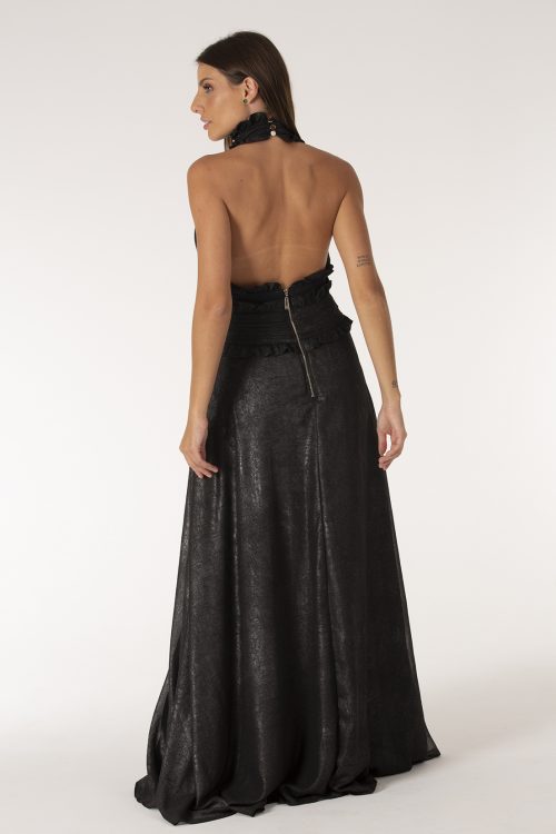 Vestido longo com design original D|A Couture, construído em Chiffon acetinado, detalhe drapeado na cintura, busto com detalhes feitos do próprio tecido e gola alta com fechamento no pescoço. Nas costas, amplo decote e fechamento em zíper de metal personalizado.