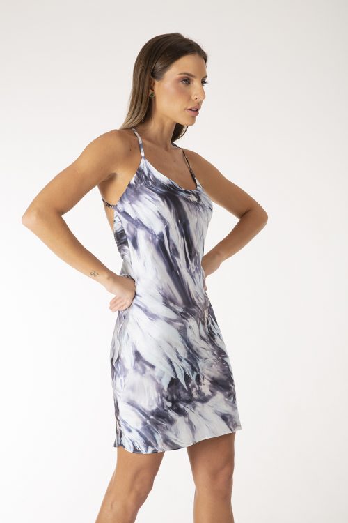 Vestido curto com design original D|A Couture, modelado em tecido fluido, com leve decote arredondado no busto e grande decote degagê nas costas com alças finas traspassadas.