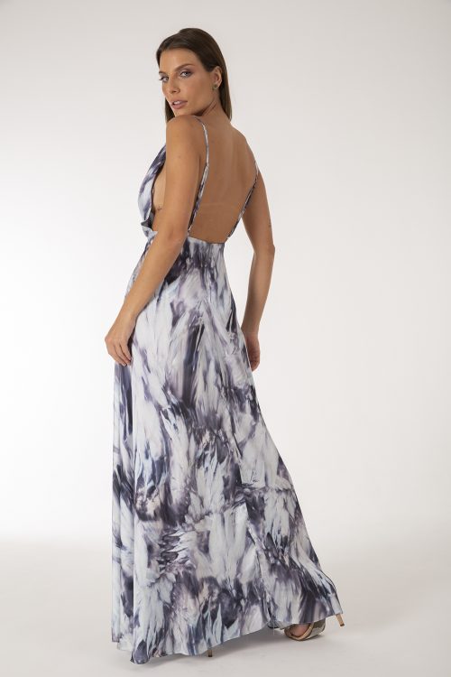 Vestido longo com design original D|A Couture, modelado em tecido fluido, decote em ‘’V’’profundo e costas abertas com finas alças reguláveis.