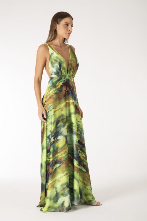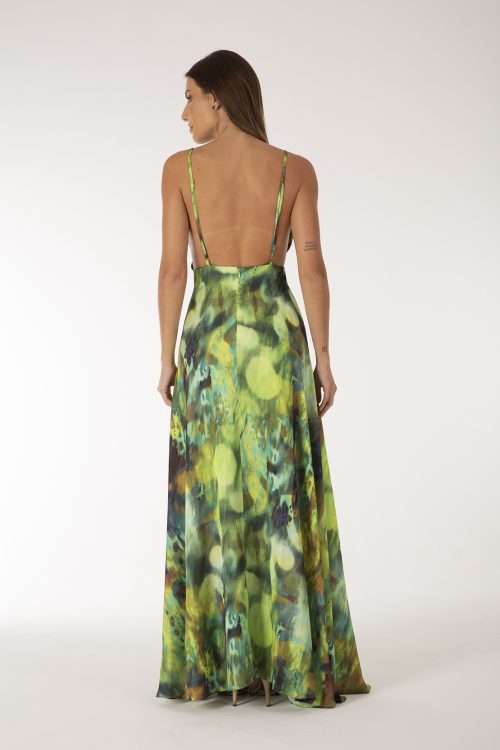Vestido longo com design original D|A Couture, modelado em tecido fluido, decote em ‘’V’’profundo e costas abertas com finas alças reguláveis.