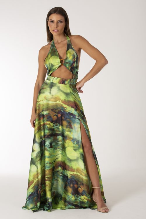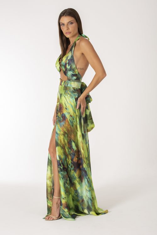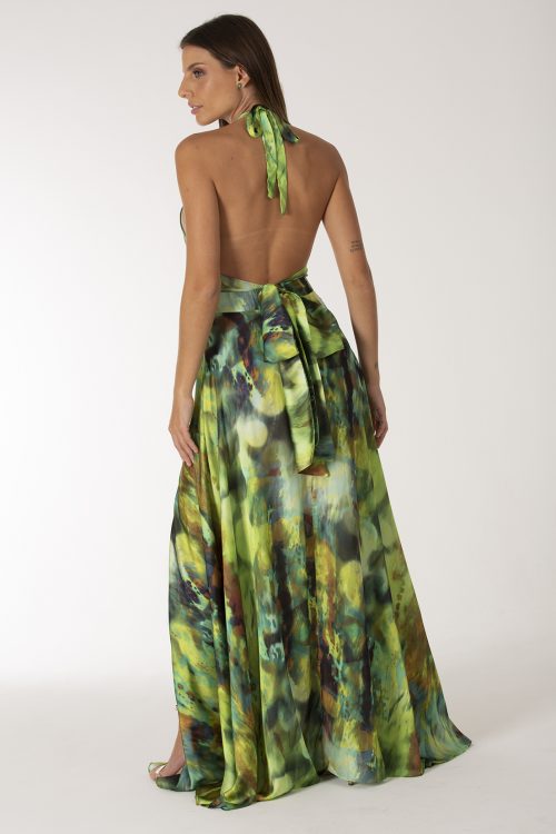 Vestido longo com design original D|A Couture, modelado em tecido fluido, com recortes, detalhe em argola central e fenda lateral. Na parte posterior, amplo decote com amarração no pescoço e generoso laço na cintura.