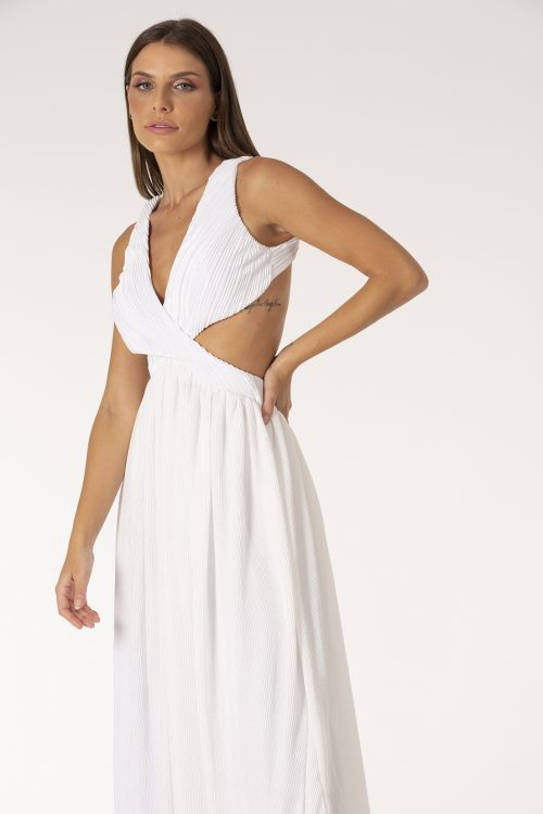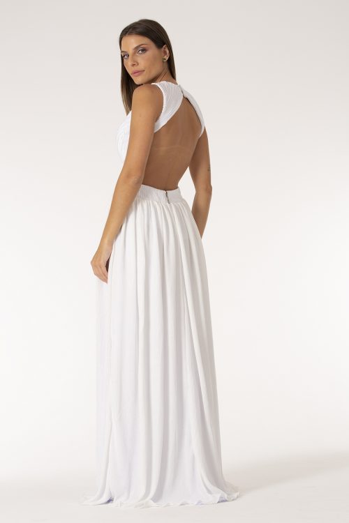 Vestido longo com design original D/A Couture, construído em tecido plissado, acetinado, recorte simétrico nas laterais e decote profundo nas costas com fechamento em zíper personalizado.